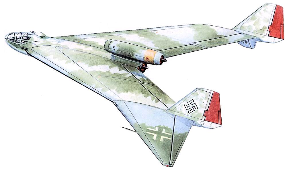 Bombardier Stratégique à grande vitesse Arado E 555-3. Le concept suivant, le E 555-3 était très semblable aux E 555-1 mais avec une motorisation différente avec l'utilisation de deux turboréacteurs haute puissance BMW 109-018 montés au-dessus et au-dessous de l'aile. Ces moteurs permettaient d’atteindre des vitesses beaucoup plus élevées qu’avec un plus grand nombre de moteurs moins puissants. La disposition de ces deux moteurs au-dessus et au-dessous de l'aile permettait également de mieux répartir la poussée. Les deux hommes d'équipage étaient installés dans une cabine pressurisée. Les trains d'atterrissage principaux à deux roues se rétractaient dans les ailes, la roue avant dans la section avant juste derrière la cabine de l'équipage. La charge de bombe pouvait être emportée en soute ou avec des pylônes d’ailes. Bombardier lourd longue portée Arado E 555-6. Comme presque tous les projets de la série E 555, le E 555-6 était également une aile volante mais d'une envergure considérablement plus grande. Les deux sections externes avaient un dièdre négatif de 20° et leur bord de fuite était perpendiculaire à l’axe longitudinal de l’appareil. La carlingue et les autres composants restaient fondamentalement les mêmes. La puissance était fournie par trois turboréacteurs BMW 109-018 (un au-dessus et deux en dessous de la section d'aile) de sorte que la poussée pouvait être équilibrée en cas de panne d’un moteur. Bien que l'envergure ait grimpée jusqu'à 28,4 mètres, la surface alaire est restée à 160 m2 en réduisant la corde et l'allongement. Des charges extérieures pouvaient être emportées sous les ailes. La capacité en carburant était de 18750 kilogrammes, le rayon d’action de 5400 kilomètres, augmenté jusqu’à 7500 kilomètres avec des réservoirs supplémentaires. L’armement défensif était composé d’une tourelle dorsale juste derrière le cockpit et de deux canons MK103 installés à la racine des ailes. A pleine charge, la vitesse calculée était de l'ordre de 875 à 900 km/h. |