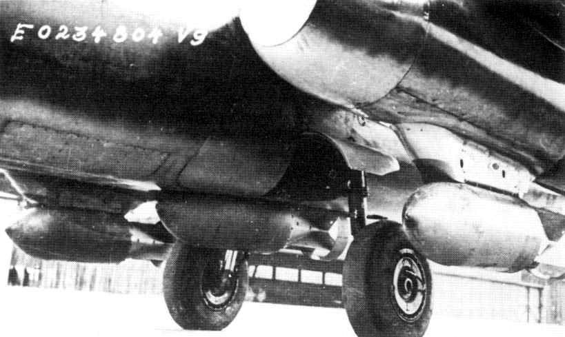 Pour les missions de bombardement, l’Ar-234 emportait une bombe blottie sous le ventre dans une cavité qui enrobait partiellement cette dernière. La charge maximale de bombes était de 1500 kg et dans cette configuration, la vitesse était réduite de 60 à 80 km/h. Il en résulta un monoplace de bombardement, doté d’un système original de contrôle de cap d’approche pour le bombardement. |