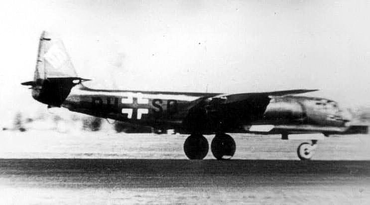 Les autres prototypes importants de l’Ar-234 était le V12 avec un empennage vertical agrandi, le V16, avec une paire de moteurs BMW 003, et les V15 et V17, également à moteurs BMW, et utilisé comme bancs d'essai pour accélérer la mise au point de ces turboréacteurs. Le V13, initialement de la série B, fut transformé en quadriréacteur à moteurs BMW 003. Il fût détruit lors de son premier vol après la panne au décollage de trois de ses quatre réacteurs. Le prototype V15 était un Ar-234B motorisé avec deux BMW 003 à la place des Jumo 004. Le 29 mars 1945, le pilote d’essais de BMW, Kappus, faillit s’écraser avec cet appareil. Il venait de décoller lorsque : «J’ai remarqué soudain que le bruit de moteur était plus fort, ce qui ressemblait à un emballement. Je fus étonné de constater que le tachymètre du moteur n 2 indiquait 11000 tours. Instinctivement je réduisis. Puis, je réfléchis et conclus qu’à un tel régime, le moteur aurait dû instantanément cracher ses aubes de turbines et de compresseur. Par conséquent, la panne devait venir du compte-tours. Il n’était pas possible que le moteur eût tourné si vite, et, comme j’étais encore «tout sorti» - train et volets -, j’avançai de nouveau en confiance la manette de gaz pour faire le tour du terrain. Ce fut une grosse erreur ! » |