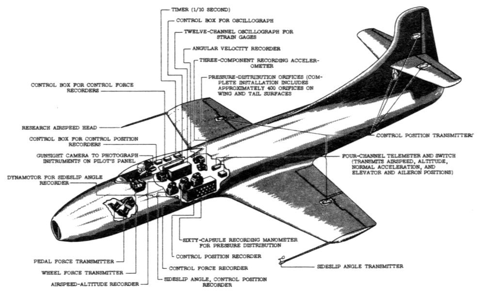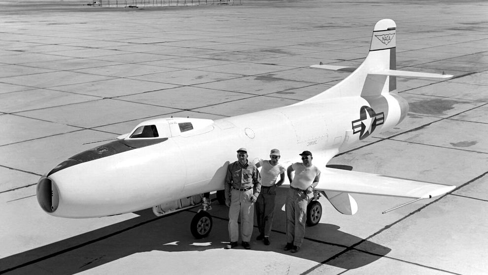 Le D-558-1 Skystreak fut conçu en 1945 par la Douglas Aircraft Company pour le compte de l’US Navy et du NACA (National Advisory Committee for Aeronautics, future NASA). A une époque ou les moyens de simulation étaient inexistants, il permit étudier les caractéristiques des avions à réaction aux vitesses transsoniques, particulièrement la stabilité et les commandes de vols. Bien que complètement éclipsé par le X-1 dans l’esprit du grand public et aujourd’hui presque oublié, le Skystreak a joué un rôle important dans la recherche aéronautique grâce à ses capacités à voler pendant de longues durées à des vitesses transsoniques. En 1944, le NACA avait lancé la construction du Bell XS-1 (renommé plus tard X-1) en association avec l’USAAF, mais celle-ci avait exigé une propulsion par moteur-fusée, seule solution alors existante pour garantir des performances supersoniques. Le NACA préférait un appareil capable de voler longtemps à vitesse transsonique pour étudier cette zone de vol délicate. La seule solution était alors d’utiliser un turboréacteur, beaucoup plus économe en carburant qu’un moteur-fusée et se tourna vers la Navy pour lancer un deuxième programme de recherche. Le responsable des programmes de recherche sur les grandes vitesses au NACA était John Stack. Celui-ci désigna Milton Davidson pour définir l’appareil en collaboration avec Abraham Hyatt, un ingénieur du BuAer (Bureau Of Aeronautics). Ils recommandèrent l’utilisation du réacteur General Electric TG-180, un moteur développé sous la responsabilité de l’USAAF et qui tournait au banc depuis avril 1944, pour propulser le nouvel appareil. Contrairement au X-1 largué d’un avion porteur, le nouvel appareil devrait décoller par ses propres moyens et emporterait une instrumentation pour étudier les phénomènes physiques rencontrés entre Mach 0.8 et Mach 1. |