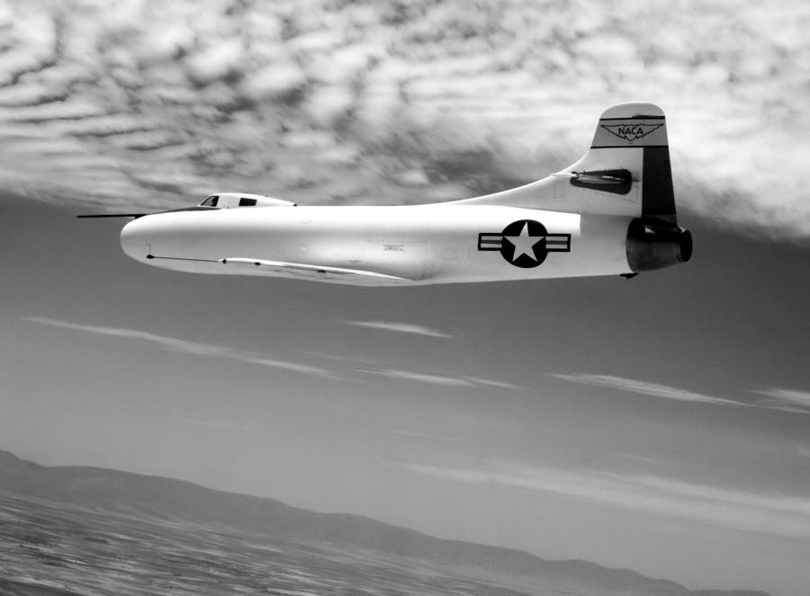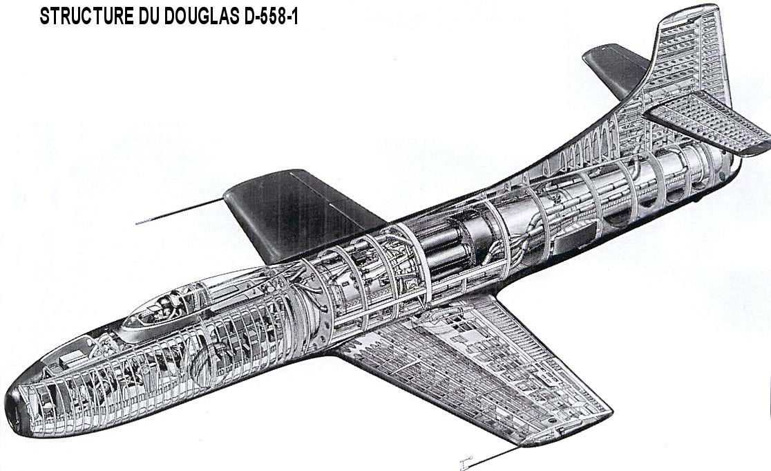 Bien que les buts du programme étaient révolutionnaires pour l’époque -le domaine transsonique et le mur du son- la conception du nouvel appareil était plutôt conservatrice avec une aile droite. Les Allemands avaient pourtant mis en service avec succès un appareil à réaction à ailes en flèche, le Messerschmitt Me-262 quelques années plus tôt. Le NACA et Douglas avaient choisi d’utiliser une aile droite mais très mince (10 % d’épaisseur relative) pour affronter les ondes de choc du vol transsonique. De plus, la structure était conçue pour pouvoir encaisser des accélérations positives de 18 g ce qui donnait une cellule très solide. Le fuselage du D-558-1 était un long cigare d’une section de 1.09 mètres et était composé, de l’avant vers l’arrière, de la prise d’air frontale, d’un cockpit pressurisé avec une canopée en goutte d’eau, un compartiment pour les instruments de mesure et enfin du réacteur TG-180 et sa tuyère. Les aérofreins étaient installés sur les cotés du fuselage juste derrière les ailes. La canopée était très petite et profilée et abritait, en fait, seulement la tête du pilote. Cette canopée était même si petite que, lors d’un vol, un pilote du NACA tourna sa tête vers l’arrière et coinça son casque dans une position très inconfortable ! Cette canopée fut ensuite remplacée par un des premiers modèles en « V » car le NACA considérait que la canopée en goutte d’eau ne protégeait pas suffisamment le pilote en cas d’accident avec retournemant à l’atterrissage ou au décollage. |