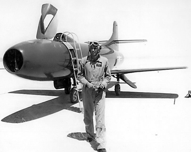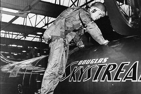 Le premier D-558-1 Skystreak (37970) arriva à Muroc Army Air Field (plus tard Edwards AFB) le 10 avril 1947. Après quelques essais de roulage, Gene May lui fit faire son premier vol le 15 avril 1947. Après avoir accéléré un long moment -les premiers jets avaient une réponse très lente à la manette des gaz- le Skystreak prit enfin les airs. Ce vol fut abrégé par des problèmes de perte de puissance du réacteur qui se renouvelèrent lors du deuxième vol, le 21 avril. L’équipe de Douglas décida de faire réviser le J-35 de l’appareil par les ingénieurs de General Electric mais ceux-ci ne trouvèrent aucun défaut. Un ingénieur de l’équipe émit l’hypothèse que la sortie de carburant dans les réservoirs structuraux était peut être trop petite ce qui pouvait expliquer une pression carburant insuffisante. Les travaux d’agrandissement de ces ouvertures furent lancés et le D-558-1 n°1 resta cloué au sol jusqu’en juin 1947. Gene May reprit alors les essais en vol et constata avec satisfaction que le moteur fonctionnait beaucoup mieux. Par contre, il fut impossible de fermer complètement les trappes du train principal puis May constata l’allumage d’un voyant incendie moteur sur le tableau de bord. Le pilote n’eut plus qu’à sortir le train et entamer un atterrissage d’urgence. Après avoir touché le sol du lac asséché, May entama le freinage ce qui se solda par l’éclatement d’un des freins du train principal ! |