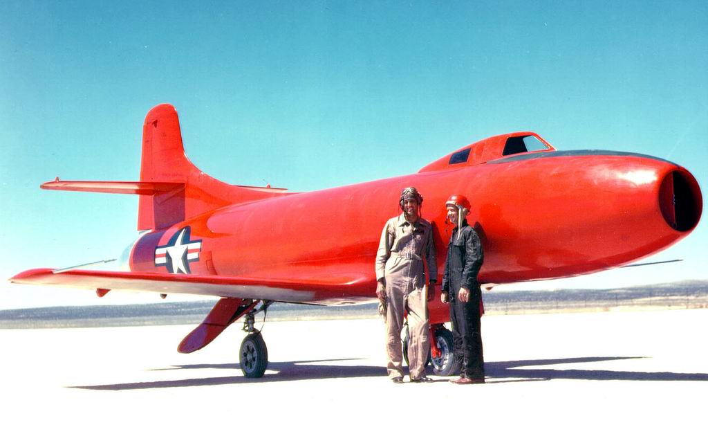 Les ingénieurs remédièrent rapidement au problème du voyant incendie -un simple faux contact- et au problème de frein mais la rétraction du train posait des problèmes beaucoup plus difficile. Les ingénieurs commencèrent par rajouter un vérin hydraulique de rétraction sur les trappes et un mécanisme de blocage des jambes du train pour le maintenir en place après rétraction. May valida ces modifications lors du neuvième vol et put ensuite commencer à explorer le domaine de vol du D-558-1. Il atteignit Mach 0.85 le 5 août 1947 alors que Bell avait atteint Mach 0.82 avec son X-1 à peu près en même temps. Les deux programmes de recherche sur les hautes vitesses de l’USAAF et de la Navy en était au même point d’avancement et la rivalité entre les deux armes allait pouvoir s’exacerber au fur et à mesure de l’annonce de nouveaux records de vitesse. C’est l’USAAF qui donna le coup d’envoi des records, mais avec un autre appareil, le Lockheed XP-80R qui battit le record du monde de vitesse le 17 juin 1947 avec 1003,7 km/h (officiellement du moins car il y a des raisons de penser qu’à cette date le véritable recordman de vitesse était en fait le Messerschmitt Me-163 Komet). Il est aussi à noter qu’un quatrième larron, le North American F-86A, vint embrouiller la saga des records de vitesse en battant le D-558 (selon certains, le F-86 fut même le premier à passer le mur du son en piqué !) |