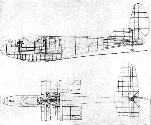 Le RP-218 n'a jamais été construit, en partie parce que Korolev fut assigné au développement du Bitch-11. En 1935, il construisit le planeur biplace SK-9 et le proposa comme banc d'essai pour moteur-fusée. Cependant, c’est le constructeur Alexei Cherbakov qui se chargera de la transformation du SK-9. Ce constructeur s’était distingué en construisant des planeurs équipés de cabine pressurisée pour le vol stratosphérique. Un de ses planeurs vola ainsi jusqu’à 12000 mètres d’altitude. En 1936, Cherbakov et A.V.Pallo commencèrent à convertir ce planeur SK-9, construit essentiellement en bois, comme banc d'essai en vol pour l'ORM-65 conçu par V.P. Glouchko et Leonid Stepanovich Dushkin. Le siège arrière du SK-9 était remplacé par un réservoir cylindrique en alliage D1 contenant 10 kg de kérosène. Immédiatement derrière, il y avait deux réservoirs en acier inoxydable pour 20 kg d'acide nitrique fumant. Le planeur avait une masse au décollage de 660 kg, une envergure de 17 mètres et une longueur de 7,44 mètres. |