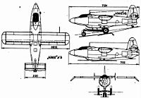 Ilya Florentyevich Florov (1908-1983) a eu une longue carrière dans plusieurs OKB et organisme d'état, certains de ses avions étant des chasseurs biplans conçus avec A Borovkov. En 1943, il dirige une cellule de conception au NII-W (institut d'essai d'état de l'Armée de l'Air) et est chargé de créer un petit avion à moteur-fusée, appelé 4302, pour étudier des profils d'aile, des systèmes de commande de vol et d'autres dispositifs. Le 4302 étaient un petit avion avec un fuselage dicté par la taille des réservoirs, de l'habitacle et du propulseur. La construction était entièrement en alliage léger avec un revêtement travaillant et une finition extérieure très soignée. A l’époque les études allemandes sur les ailes en flèche n'avaient pas encore été étudiées par les Russes et l’appareil fut équipé d’ailes droites. Ces ailes avaient un profil laminaire du TsAGI et une épaisseur relative de 13%. Elles étaient construites d’une seule pièce et étaient fixées au-dessus du fuselage avec des saumons inclinés vers le bas. Sur chaque bord de fuite il y avait trois sections de volet qui étaient également utilisé en opposition comme ailerons. |
