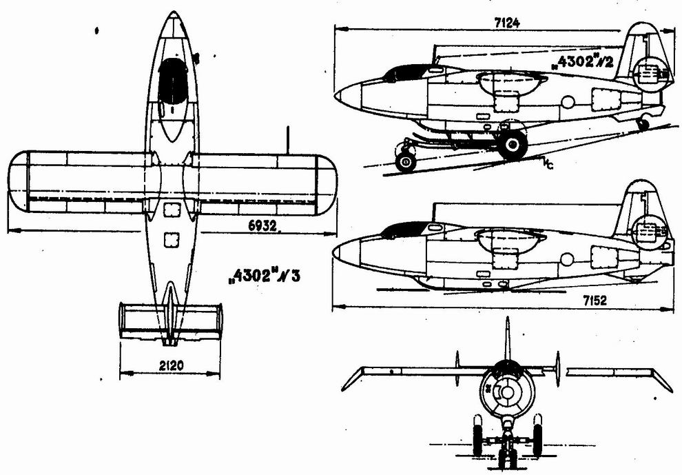 L'avion n°3 devait être équipé d'un moteur RD-2M-3 de Dushkin et Glouchko. Ce moteur à deux chambres avait une poussée de 400 à 1450 kilogrammes suivant le nombre de chambre allumée. Avec ce moteur l’appareil aurait été appelé 4303. Ce moteur fut également utilisé dans une version légèrement différente sur le Mikoyan I-270. Trois exemplaires du 4302 furent construit et deux pilotes du NII, F. Pakhornov et I. F. Yakubov furent désignés pour réaliser les tests en vol. L'avion n°1 n’était pas équipé de moteur et réalisa 46 vols planés à partir de 1946, remorqué jusqu’à 5000 mètres d’altitude par un Tu-2. Le n°2 était, lui, équipé de son moteur-fusée, le premier décollage ayant eu lieu en août 1947 avec Pakhornov aux commandes. Le même mois le programme était terminé, les fonds étant transférés vers le programme Mig I-270. Au même moment, l'avion n°3 était achevé mais en attente de son moteur RD-2M-3. |