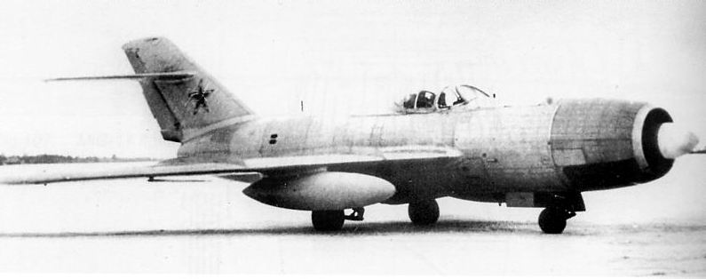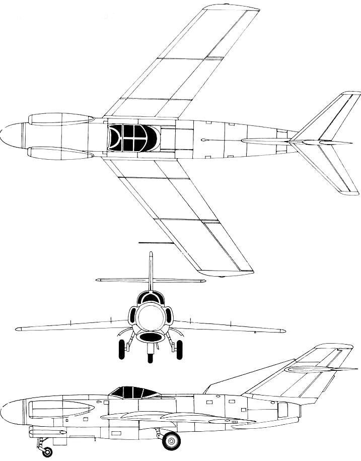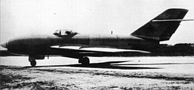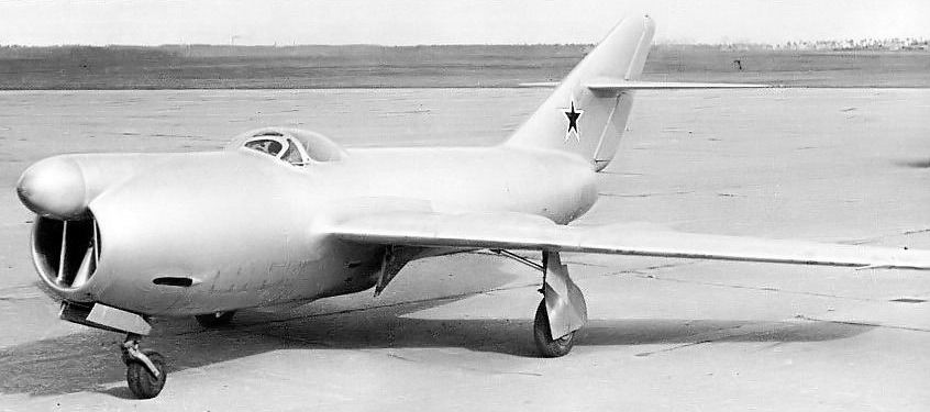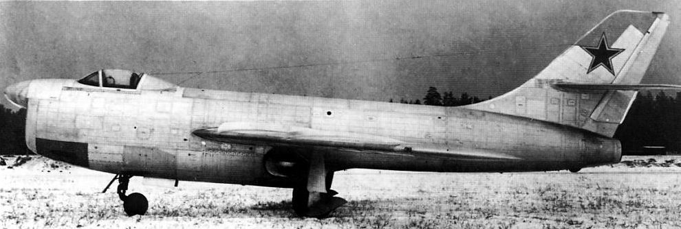Ce gros diamètre interdisait de disposer les deux moteurs côte à côte dans le fuselage ou le montage en nacelle pour des raisons de traînée aérodynamique. La seule solution était donc de disposer les deux moteurs en tandem dans le fuselage. La propulsion était donc composée de deux réacteurs RD-45F de 2270 kgp chacun (puis deux VK-1 de 2700 kgp sur le deuxième prototype). Le réacteur avant était installé sous le poste de pilotage, sa tuyère débouchant sous le fuselage comme sur les premiers Lavotchkine à réaction. La tuyère du réacteur arrière débouchait, elle, sous l’empennage, à l’extrémité du fuselage. Il est intéressant de noter que les deux autres constructeurs impliqués sur ce concours (Sukhoï avec le Su-15 « P » et Mikoyan avec le MiG I-320) adoptèrent exactement la même configuration sur leur propre appareil. L’entrée d’air des moteurs était dans le nez et elle avait une section circulaire. Cette entrée se divisait juste après les lèvres en trois sections, deux latérales pour alimenter le moteur avant, et une supérieure pour alimenter le réacteur arrière. |