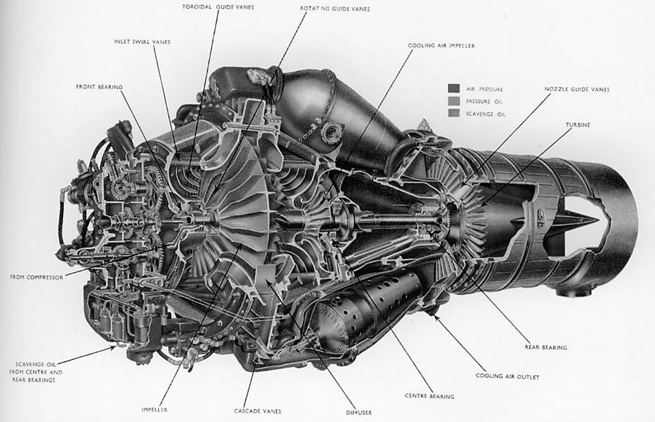 Dès le début, il était clair pour les Russes que les turboréacteurs allemands n’étaient qu’une solution de transition pour équiper les premiers jets soviétiques et acquérir à bon compte cette technologie en attendant que les constructeurs nationaux prennent le relais. En effet, les turboréacteurs allemands et leur dérivés russes n’offraient qu’une durée de vie limitée, une consommation élevée et une masse élevée par rapport à leur puissance. De plus, le système de démarrage utilisait de l’essence ce qui imposait l’installation de petits réservoirs spécifiques puisque le turboréacteur consommait du kérosène. Le seul avantage de ces moteurs était leur conception à compresseur axial qui offrait une section frontale plus petite que les modèles à compresseur centrifuge. En 1946, les efforts de Lyulka n’avaient pas encore donnés de résultats vraiment satisfaisant et les Russes décidèrent d’acquérir la technologie occidentale d’une manière ou d’une autre et à cette époque, seuls les Britanniques étaient aussi avancés que les Allemands en matière de turboréacteur. Le 6 avril 1946, Staline présidait une réunion au Kremlin pour étudier ce problème avec les principaux responsables politiques et constructeurs du pays. D’après les renseignements russes, les moteurs britanniques Rolls-Royce Derwent 5 et Nene 1 commençaient à entrer en production pour équiper les chasseurs à réaction Gloster Meteor et De Havilland Vampire. Les moteurs britanniques n’avaient pas les défauts des moteurs allemands, une durée de vie plus longue, une puissance supérieur pour le Nene 1 et un système de démarrage électrique. |