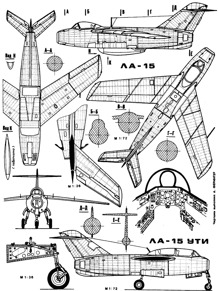 Le La-15 fut construit en beaucoup moins d’exemplaire que le MiG-15 malgré une conception plus avancée que ce dernier. Il semble aussi qu’il ne fut pas construit en grande quantité car la technologie de l’avion était plus coûteuse que celle du MiG-15. Environ 500 La-15 furent construit et utilisés jusqu’en 1954 comme chasseur léger de jour et d’appui au sol. Le La-15 fut apprécié pour sa légèreté, sa manœuvrabilité, son habitacle, vaste et confortable pour un si petit avion, avec une instrumentation bien disposée et son excellente visibilité. Le La-15UTI était une version d’entraînement biplace du La-15 désigné La-180 par le constructeur mais sa production en série fut annulée en décembre 1949. |