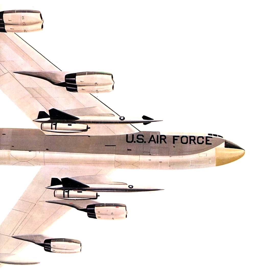 En février 1958, des inquiétudes croissantes concernant l'équilibre stratégique vis à vis de l’URSS et la vulnérabilité croissante des bombardiers de l'US Air Force incitent l’USAF à accélérer le programme Hound Dog. North American progresse alors rapidement dans le développement du missile et le premier XGAM-77 est lancé d'un B-52 le 23 avril 1959. En 1959, l’US Air Force approuve une force de 29 escadrons de B-52 équipés de missiles "Hound Dog" puis le 21 décembre 1959, le Général Thomas S. Power, commandant en chef du Strategic Air Command, se fait remettre les premiers "Hound Dog" de production lors d’une cérémonie à l’usine de Downey de North American Aviation. La première unité de B-52G équipée de Hound Dog est le 4135th Strategic Wing, basée à Eglin AFB en Floride. |