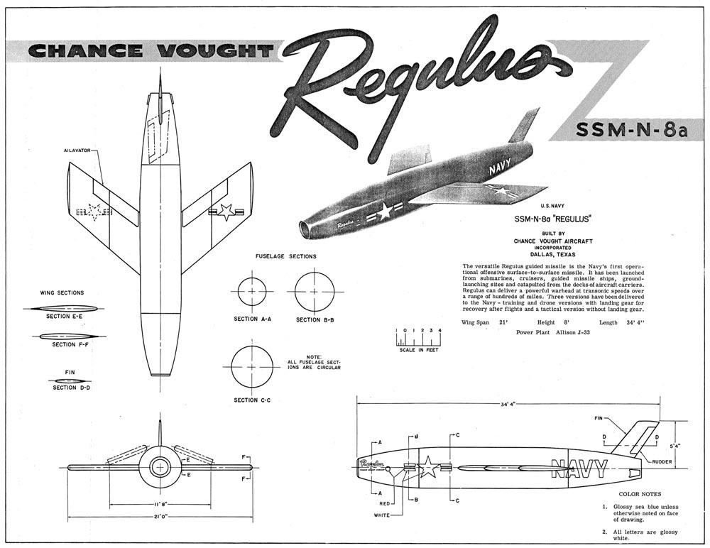 Fuselage. Le missile «Regulus» avait une masse totale de 6350 kg dont 1360 kg étaient réservés à la charge explosive, nucléaire ou conventionnelle Le fuselage était dimensionné autour du diamètre du moteur à réaction Allison J-33. Le fuselage était composé d'une section avant, médiane et arrière et affichait une longueur de 10,31 mètres. La construction semi-monocoque entièrement métallique faisait largement appel au matériau ultra-léger Metalite. Le moteur était fixé sur la section médiane et la section arrière était fixé sur l'arrière du moteur. Toutes les pièces en aluminium étaient plus épaisses que la normale en raison de la décision d'adopter des facteurs de résistance plus élevés et pour ne pas avoir à réaliser les essais de résistance structurales habituels.