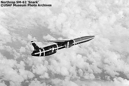 Sur le modèle E qui suivi peu après, Northrop avait diminué la masse à vide de 900 kg et augmenté la masse en ordre de vol de 2270 kg. Le N-69E, prototype du SM-62 (désignation opérationnelle, SM pour Strategic Missile), vole pour la première fois en juin 1957. De son coté, l'US Air Force lance son premier Snark le 1er octobre 1957. Sur les sept premiers lancements de l'US Air Force, seulement deux ont atteint la zone visée mais à plus de 5 km de la cible. Les problèmes principaux restaient la précision et la fiabilité du missile. Lors des vols sur une distance supérieure à 3000 km, le missile avait une CEP moyenne de 9 kilomètres. En fait, jusqu'en février 1960, aucun Snark n’a réussi un vol longue distance avec précision et par rapport aux dix derniers vols réalisés, le système de guidage avait moins de 50 % de chance de conduire le missile sur sa cible. En outre, le système de guidage, avec le système de commande de vol, était responsable d’environ la moitié des pannes du missile. Les résultats d'essai montraient que le Snark avait une chance sur trois de décoller et seulement une sur dix de parcourir la distance prévue. A la fin des années 50, le SAC était préoccupé par la vitesse relativement réduite du Snark et de son incapacité à opérer dans la stratosphère, caractéristiques qui rendait le missile très vulnérable à l'interception. De plus, les nombreuses pannes au lancement et avec le système de guidage avaient soulevé des questions sérieuses concernant la fiabilité du système d'arme. |