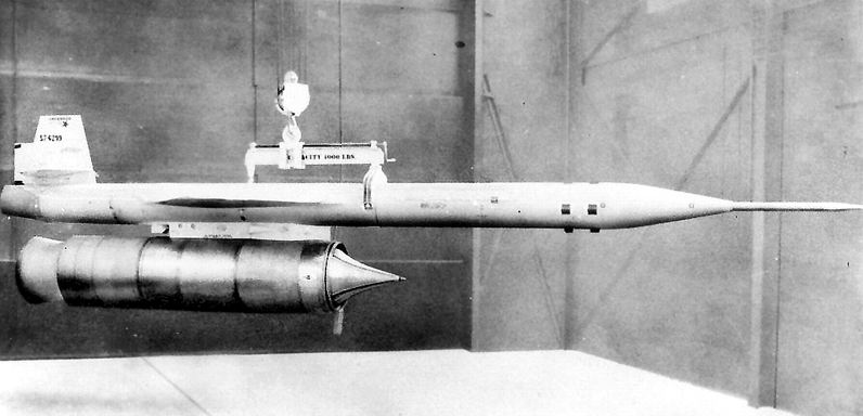 Les Américains désiraient également ouvrir le domaine de vol des statoréacteurs et construisirent pour cela un véhicule de la fameuse série X, le Lockheed X-7. L’origine de cet engin remonte en fait à 1947 quand Lockheed réalisa une étude pour déterminer les caractéristiques d'un véhicule sans pilote conçu pour servir de banc d'essai en vol au statoréacteur Marquardt XRJ-37 MA-1. Le X-7 (voir histoire du X-7) avait un fuselage circulaire avec un statoréacteur monté en pod à l’arrière et une aile trapézoïdale implantée à mi-hauteur à large corde et à faible allongement. Le X-7 était largué d’un B-29 puis accéléré avec un booster Allegheny Ballistics Laboratory de 47628 kgp. Ce booster avait d’importantes surfaces aérodynamiques pour obtenir une bonne stabilité directionnelle. A l’issu de la mission, le parachute d’extraction était déployé à approximativement 7600 mètres d’altitude à une vitesse subsonique. Le parachute principal était déployé peu après, habituellement à une altitude d'approximativement 3300 mètres et une vitesse de 700 km/h puis le X-7 se plantait dans le sol en attendant d’être récupéré pour une autre mission. Les essais en vol débutèrent en avril 1951 avec beaucoup de difficultés et en 1954, la plupart des vols n’avait été que des succès partiels. Les vols initiaux du X-7 furent principalement consacrés à la mise au point des statoréacteurs Marquardt RJ43-MA-3 destinés au Boeing Bomarc un missile d’interception longue portée à tête nucléaire. Le X-7 expérimenta également des statoréacteurs pour le Drone Lockheed D-21 et des versions améliorées du Bomarc. Jusqu’à la fin des essais en 1960, le X-7 s’adjugea à plusieurs reprises et en alternance avec les engins français et soviétiques les records du monde de vitesse et d'altitude pour véhicule aérobie. Le record de vitesse fut de mach 4.31 et le record d’altitude de 32330 mètres. |
