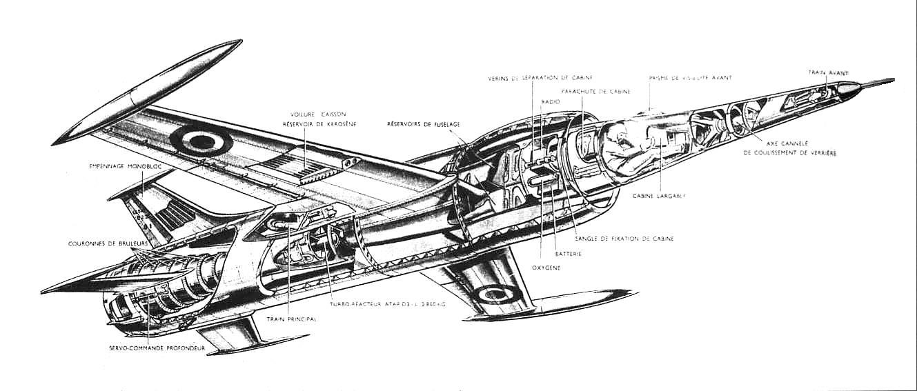 De construction classique, le fuselage était essentiellement constitué par un statoréacteur à double paroi, qui supportait à la fois la voilure, la dérive, le train d’atterrissage et la protubérance dorsale contenant la cabine. Le train d'atterrissage était un tricycle classique s'escamotant dans le fuselage. Monté dans l'axe de la tuyère et soigneusement caréné, le réacteur « Atar » 101E-3 à post-combustion de 3500 kgp de poussée projetait ses gaz chauds à l'intérieur de ceux sortant des viroles du statoréacteur. Les deux flux étaient séparés par l'air de ventilation rejeté par le turboréacteur. Le diamètre de la chambre du combiné turbo-statoréacteur atteignait 1500 mm. Le premier vol du prototype n° 01, eut lieu le 20 septembre 1955 avec André Turcat aux commandes. Cet appareil était dépourvu du statoréacteur et servit simplement à la mise au point de la formule aérodynamique du Griffon. |