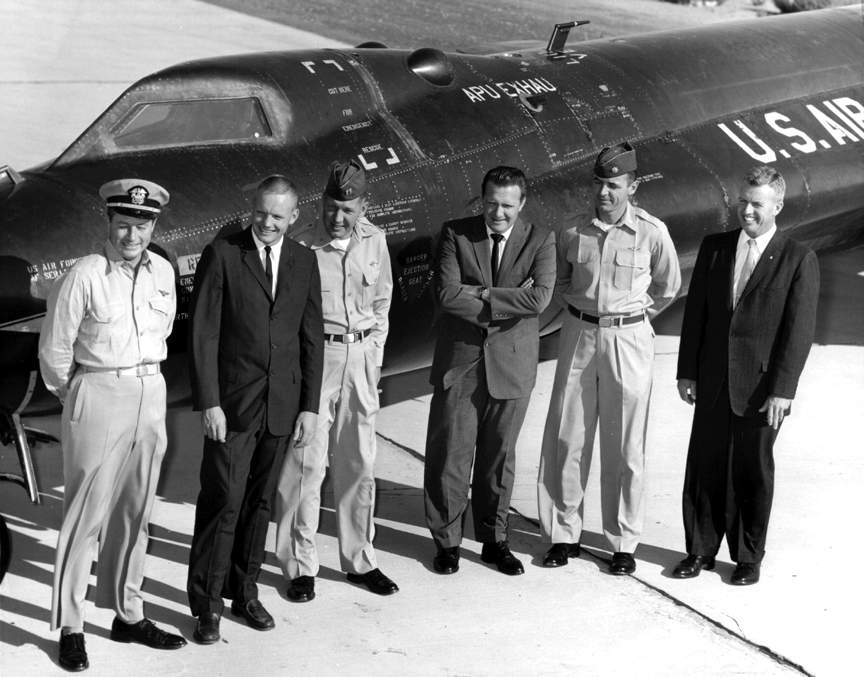 Au sommet de sa trajectoire à 23609 m. l'avion avait atteint Mach 2,6 et s'apprêtait maintenant au sprint final jusqu'à Mach 3,31 pendant une descente de plus en plus pentue. La vitesse maximale enregistrée par les radars atteignit 3533 km/h : le record de 1956 avait désormais vécu ! Cependant, le X-15 était encore loin des limites de son domaine de vol et Joe Walker savait que son record ne durerait pas longtemps, pas plus que les prochains. L'extinction des moteurs, faute de propergols, se produisit à 27200 m, le X-15 termina sa trajectoire par une ressource à -4 g pour passer en vol horizontal avant les manoeuvres de vérification de la stabilité à différents angles d'incidence. Edwards prévint le centre de contrôle, moins de cinq minutes après le largage au-dessus de Silver Lake et Walker prit ses repères extérieurs pour atterrir, au terme d'une mission effectuée aux instruments, exactement comme en simulateur. Tandis que l'avion glissait sur le Rogers dry Lake, les contrôleurs stupéfaits entendirent un très sonore "Yeppiii !!" : Walker retrouvait son exubérance et savourait la joie d'être recordman. Depuis le vol à Mach 2 de Scott Crossfield en 1953, c'était la première fois qu'un pilote d'essais du NACA (ou de la NASA) s'attribuait un record sur avion-fusée. Mais l'Air Force, et son champion du moment, Bob White, ne pouvaient rester inactifs. Ils s'apprêtaient maintenant à partir là ou jamais personne n'était encore allé : au seuil de l'espace, à plus de 40 km d'altitude. Après une tentative infructueuse le 11 août l960, la mission d'altitude ("1-10-19") du Major White eut lieu le 12 août avec un succès total. L'avion-mère commandé cette fois par le Major Hugh L Fulton (USAF) décolla d'Edwards à 8h01. suivi des avions d'accompagnement. deux F-104 pilotés par le Cne Robert A. Rushworth (la doublure de White) et le Cdr Forrest S. Petersen (US Navy). Trois quarts d'heure plus tard. le X-15 se détacha de la Stratofortress et Bob White procéda aussitôt à la délicate mise à feu des moteurs. Descendu à 11900 m. l'avion remonta bientôt jusqu'à 16300 m. White se mit en vol horizontal pour accélérer jusqu'à Mach 1.9 puis il partit en chandelle, tirant à fond sur le manche et maintenant un angle d'incidence de –16°. Au bout de 265 s de fonctionnement à pleine poussée, les XLR-l1 s'éteignirent, à cours de propergols. |