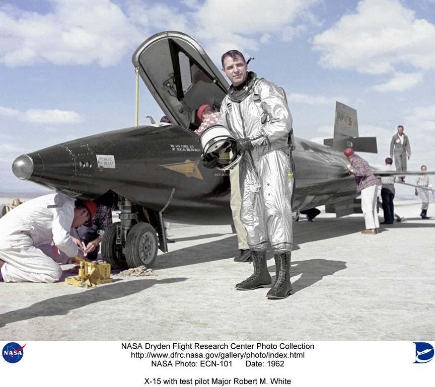 Premier homme à franchir Mach 4, en mars 1961, le Major Bob White fut également le premier à atteindre Mach 5 (mission 2-17-33) avec une marge confortable (Mach 5,27) le 23 juin suivant, au cours d'un vol plutôt pénible tant pour le pilote que pour la machine. Peu après le largage, la cabine subit une dépressurisation, entraînant le gonflage de la combinaison du pilote dont les mouvements furent alors entravés. Pour éviter d'avoir à bouger les bras, White utilisa le mini-manche de contrôle de bout en bout de la mission, y compris pour l'approche et l'atterrissage. Par ailleurs, ce vol à Mach 5+ fit souffrir le revêtement de l'aile, dont l'extrados fut porté à la température de 440 °C en arrière des joints d'expansion de bord d'attaque ; l'écoulement de l'air y devint turbulent. Le 11 octobre 1961 pour le mission 2-20-36, Bob White et le X-15 n° 2 atteignirent 66 150 m d'altitude, valeur un peu supérieure de 8 % à l'objectif prévu, à cause d'un angle de montée supérieur, pendant une poignée de secondes, aux 32° prévus. Toutefois, le seul dommage que ce dépassement provoqua, fut de froisser l'exigeant amour propre du pilote ! Au sommet de la parabole, la pression dynamique autour de l'avion avait chuté à 14,65 kg/m2 mais la descente jusqu'à une altitude où l'avion pouvait retrouver une pression suffisante, de l'ordre de 1 270 kg/m2, pour voler à nouveau, se fit en douceur, sans amorce de décrochage et avant même que le véhicule ne quittât l'impesanteur relative. Après avoir utilisé le manche de contrôle associé au dispositif de stabilisation par micro-fusées, sur la trajectoire balistique, White reprit vite le mini-manche " high g " pour contrôler le véhicule, dès lors que les accélérations augmentèrent, qui devaient atteindre + 4,5 g durant la rentrée atmosphérique. La température du véhicule grimpa jusqu'à 480°C ; ceci eut une conséquence inattendue et spectaculaire lorsque le X-15 effectua son rétablissement final à basse altitude. La couche externe du pare-brise gauche se fissura complètement, à cause du refroidissement différent de la vitre et de son encadrement métallique. Toutefois, White gardait assez de visibilité sur la droite et, avec l'aide efficace des avions d'accompagnement, se posa sans encombre sur le Rodgers dry Lake. |