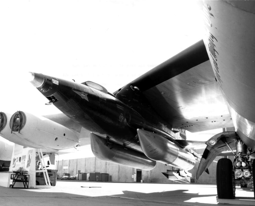 Le 17 février 1965, le Major Rushworth effectua la mission "2-36-63" qui devait évaluer l'influence de la charge scientifique sur le comportement en vol du X-15A-2. Cette fois, le train avant ne provoqua aucun problème mais, alors que l'avion volait à 4 600 km/h et 27 000 m d'altitude, le train d'atterrissage droit se déploya soudain. Le train principal fut vérifié à l'occasion du vol suivant, le 28 avril 1965, avec John Mc Kay (mission 2-37-64). Au cours de cette mission, un suiveur stellaire, installé dans la soute à équipements et comportant quatre caméras de 35 mm pour photographier le rayonnement ultraviolet des constellations, fut essayé avec succès. Les prises de vue commencèrent le 8 juillet 1965 (mission 2-40-72), lors d'un vol jusqu'à 64 800 m, et concernèrent l'étoile Gamma-Cassiopée (la troisième, en magnitude, de la constellation " Cassiopée "). Par la suite et jusqu'en août 1966, le X-15A-2 photographia ainsi d'autres étoiles dans des constellations diverses. Le 18 mai 1965, Mc Kay effectua le premier vol (mission 2-38-66) du X-15A-2 dépourvu de la partie détachable de la dérive ventrale ; d'autres vols suivirent dans la même configuration, sans histoire. Le premier vol (mission 2-43-75) du X-15A-2 équipé, pour la première fois, de ses réservoirs externes (vides), intervint le 3 novembre 1965, avec le Lt-Col Rushworth dans le cockpit. Largué à la verticale de Cuddeback, le véhicule atteignit Mach 2,31 et 21 520 mètre avant l'éjection des réservoirs. La manoeuvre se déroula convenablement mais, par suite d'une défaillance du parachute, le réservoir de combustible s'écrasa dans le désert. L'étape suivante, avec réservoirs externes pleins, ne fut franchie que le 1er juillet 1966 (mission 2-45-81), avec toujours Bob Rushworth aux commandes. La séquence initiale se déroula correctement, avec un allumage du moteur 1,2 seconde après séparation de l'avion-mère. Quelques secondes plus tard, le centre de contrôle au sol, sur la foi des mesures transmises, avertit Rushworth d'un problème de transfert de propergols. |