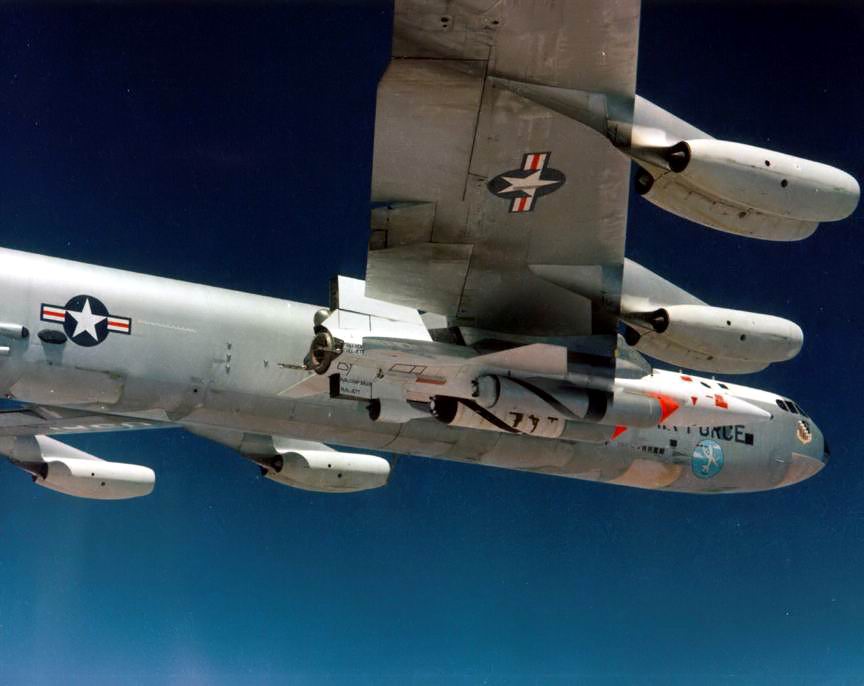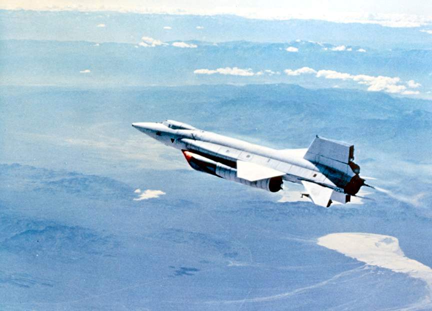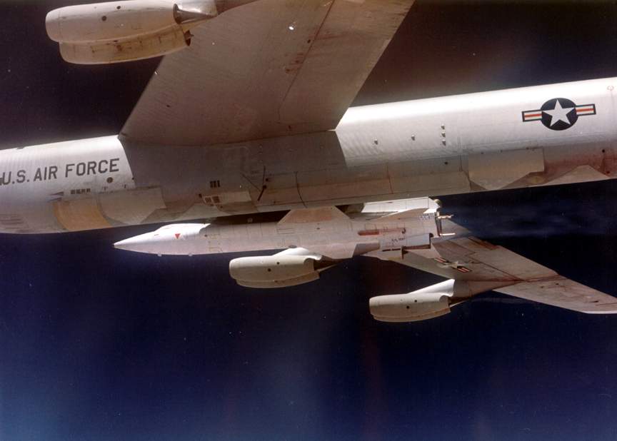 Le 3 octobre 1967 (mission 3-53-97), le X-15A-2, entièrement revêtu d'une couche rafraîchie de MA-25S (sauf la "Q-Ball" du nez), flanqué de ses réservoirs externes, équipé de sa paupière et emportant la maquette du statoréacteur, fut monté sous l'allé de l'avion-mère NB-52. A bord de l'avion expérimental, "Pete" Knight était trop absorbé par sa check-list pour comprendre qu'il entrait dans la légende derrière Chuck Yeager, Pete Everest, Iven Kincheloe ou, plus récemment, Bob White. A la verticale de Mud Lake, le largage intervint et le X-15A-2 grimpa aussitôt, à pleine puissance, à l'incidence de 15°. L'angle de montée fut ensuite maintenu constant jusqu'à l'altitude de basculement. |
