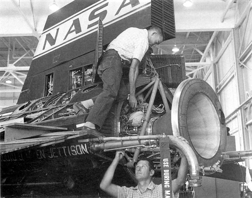 Le XLR-99 était d'une grande complexité mécanique. La chambre de combustion, dans sa version finale, avait un col d'un diamètre de 21,9 cm et une tuyère d'un diamètre de 99,8 cm. La chambre était refroidie par le combustible, et sa construction utilisait un faisceau de 196 tubes d'acier inoxydable. Le liquide réfrigérant circulait dans un sens à l'intérieur d'un tube, et dans l'autre sens à l'intérieur du tube adjacent. Après avoir longtemps investi sur un injecteur en serpentin, l'industriel s'était orienté vers un autre modèle en forme de pomme d'arrosage, réalisé en Inconel X. Le système d'allumage comprenait deux étages. Au premier, le mélange comburant/combustible était enflammé par une bougie. Le produit de la combustion servait alors à allumer le deuxième étage. La turbopompe était alimentée par du peroxyde d'hydrogène vaporisé à 740°C. Ce gaz entraînait par l'intermédiaire d'une turbine, deux pompes, l'une pour l'oxygène liquide à 13 000 tours/min et l'autre pour l'ammoniaque à 20 790 tours/min. Le flux du mélange vers la chambre de combustion atteignait 5,9 tonnes/min à pleine poussée ! La modulation de la poussée s'obtenait simplement par variation de la vitesse de rotation de la turbopompe. Le 18 avril 1959, l’Air Force réceptionna le premier des quatre moteurs associés au programme de qualification. Le calendrier établi au printemps 1959 prévoyait la conclusion du programme au premier septembre et la livraison à Edwards du premier moteur " bon de vol " (sur une dotation totale de 12) pour la fin juillet 1959. Mais ces prévisions, une fois de plus, s'avérèrent très optimistes. En définitive, il fallut attendre le 28 mars 1960 pour voir le XLR-99 à Edwards. Quant au programme de qualification, il ne démarra qu'en septembre 1960 et sa conclusion, quatre mois plus tard, coïncida avec la fin des essais en vol du X-15 équipé du gros moteur. Dès lors que le X-15 et son moteur étaient en construction, il était temps de s'occuper de la phase suivante. |