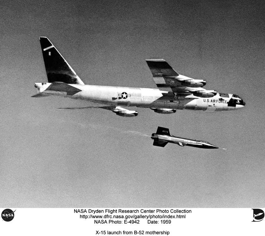 A 7h53, le 8 juin 1959, la mission "1-1-5" débuta par le déploiement du dispositif de sécurité, composé de véhicules incendie et d'un hélicoptère H-21. Quelques minutes plus tard, les avions d'accompagnement, deux F-100 et un F-104, décollèrent rapidement devant le NB-52A porteur des vedettes de ce cortège, le X-15 n° 1 et Scott Crossfield. Une demi-heure après le décollage, la "Stratofortress", croisant à 11 600 m au-dessus du désert de Mojave, avertit le sol, par la voix de Chuck Bock, que le compte à rebours du largage avait franchi le cap des cinq minutes. A 8h39, le "T minus one minute" (Heure H moins une minute) résonna aux oreilles de Crossfield qui poursuivait tranquillement sa check-list. "Les avions d'accompagnement sont parés, Scott" signala Bock, puis les dernières secondes furent comptées. De puissants haut-parleurs au bord de la piste, transmettaient ces annonces. La tension s'accroissait. — Cinq... quatre... trois... deux... un... larguez ! A la verticale du Rosamond dry Lake, à une trentaine de kilomètres au sud-ouest d'Edwards, le X-15 se séparera du NB-52 pour la première fois et proprement ; on avait craint que la dérive dorsale ne fût venue heurter les bords de l'échancrure pratiquée dans le bord de fuite de l'aile du bombardier, et ait déséquilibré le X-15. Celui-ci était désormais livré à lui même, dans le ciel pur de Californie, et se comportait de façon satisfaisante. — 10 970 m d'altitude ; excellent comportement général annonça Crossfield. "Les APU ont l'air de fonctionner correctement. J'ai l’oiseau tellement bien en mains que j'ai presque envie d'essayer un tonneau barrique" En fait de tonneau, Scott se limita à des manœuvres plus prudentes, quelques virages et un essai de déploiement des volets, au long de sa descente en S. Le X-15, piloté avec le mini-manche latéral ("high g"), se présenta bientôt pour l'atterrissage. Crossfield commença par larguer la section inférieure de la dérive ventrale puis s'aligna en finale à 500 m d'altitude et à 500 km/h de vitesse indiquée. Huit secondes plus tard, Il abaissa les volets à fond (-38°). L'avion se mit à osciller violemment à plus ou moins 5° sur l'horizon : l'amortisseur de tangage du SAS était tombé en panne. Cette défaillance, due à une erreur de manipulation au sol, avait été découverte lors des contrôles précédant le largage. Crossfield agit donc au mieux avec la gouverne de profondeur, mais la situation, loin de s'améliorer, empira, à cause d'un mauvais réglage du mini-manche. "Le X-15 tanguait comme une barque sur une mer déchaînée !", raconta Crossfield. "Nous plongions vers le désert à plus de 300 km/h. il fallait absolument que le contact au sol se fasse exactement en phase avec le bas d'une oscillation, sinon je savais que je casserais la machine." — Scott, tu es maintenant à 230 (pieds), Relax... Trains sortis... OK... 30 (pieds), lui disait Bob White, qui observait attentivement la situation depuis le cockpit de son F-104, et guidait le retour du X-15 vers la plus longue piste du Rogers dry Lake. Et Crossfield, tout en luttant avec un admirable sang-froid, broyait du noir: " J'étais complètement absorbé par mon effort pour sauver l’avion, pour le ramener entier, mais une pensée amère s'était infiltrée en moi et devenait obsédante : malgré tout notre amour, toutes nos études, et en dépit de notre volonté de perfection, le X-15 s'avérait complètement instable". |