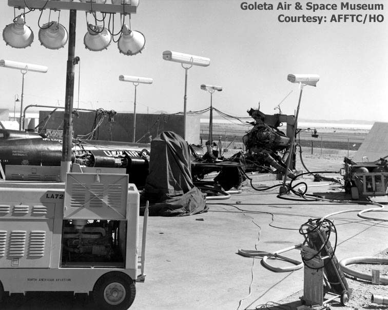 Depuis le début de 1960, les essais en vol du X-15 progressaient à grands pas. En mai, on put dresser un premier bilan. La première partie des essais constructeur, était terminée. Avec les petits moteurs XLR-11, les pilotes officiels, Walker (NASA) et White (USAF) avaient déjà poussé le X-15 jusqu'à Mach 3,19 et 33 222 m d'altitude. Les records du Bell X-2 (Mach 3,196 et 38 465 m) n'étaient pas loin et seraient franchis dans les semaines à venir. Enfin, le gros moteur XLR-99 était arrivé à Edwards le 28 mars, et son installation dans le X-15 n° 3 était terminée. La deuxième partie du travail de North American et de Crossfield devait démarrer le 18 juin, après trois essais au banc. Dans l'après-midi du 8 juin, le n° 56-6672 était en position sur la plate-forme pour le deuxième essais au banc et Scott Crossfield, sanglé dans le cockpit, prêt à piloter le XLR-99 suivant les instructions des ingénieurs. "Après d'ultimes vérifications, se souvient Bob Thompson, l'un des ingénieurs de North American présent sur le site, Scotty reçut le "go" pour l'allumage du XLR-99 à 30 % de sa puissance maximale. Au bout de 10 secondes, toutes mesures effectuées, on coupa le moteur. La séquence suivante prévoyait un fonctionnement à mi-puissance pendant 15 secondes. Calmement, Scott remit en route mais signala aussitôt l’allumage d'un témoin et une poussée nulle. Le XLR-99 s'arrêta de lui même et le témoin s'éteignit. On suppose que Scott s'imagina que le problème, quel qu'if fut, s'était résolu de lui-même. Quoiqu'il en fût, il ralluma la torche et c'est alors que le tonnerre de Dieu s'abattit sur nous! Je n'ai jamais entendu une explosion aussi forte et aussi sonore que celte qui survint alors. Tout le blockhaus vibra. C'était réellement effrayant et, pour nous, il ne faisait aucun doute que nous avions perdu Scotty." |
