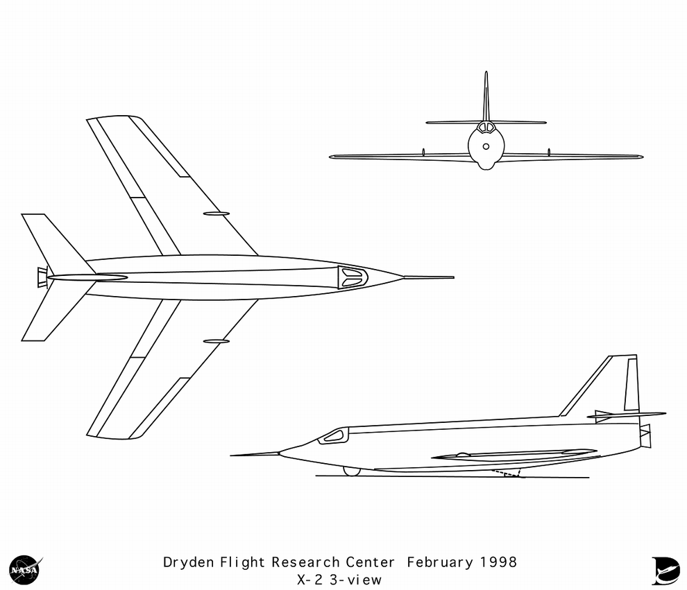 Les ailes étaient implantées sur le fuselage en position basse et elles avaient une flèche de 40° à 25 % de la corde avec un profil NACA biconvexe. Elles étaient construites en acier inoxydable aussi bien au niveau de la structure interne que du revêtement. Elles étaient équipées d’aileron de 1 m3 capable de s’abaisser de 17°, de flap de 1.13 m2 s’abaissant de 15°, de petites cloisons d’extrados et enfin de becs de bord d’attaque. La dérive avait une surface de 3.59 m2 et une flèche de 32° à 25 % de la corde. Les empennages horizontaux avaient une surface de 4 m2 et une flèche de 40° comme les ailes. Les commandes de vol permettaient d’actionner hydrauliquement les ailerons, les stabilisateurs horizontaux monobloc et le système de verrouillage au neutre du gouvernail de direction en supersonique. Le tout premier système de commande de vol électrique « Fly-by-wire » fut installé sur le X-2 sous la forme d’un moteur électrique commandant la sortie simultanée des volets de courbure et des becs de bord d’attaque en prévision de l’atterrissage.