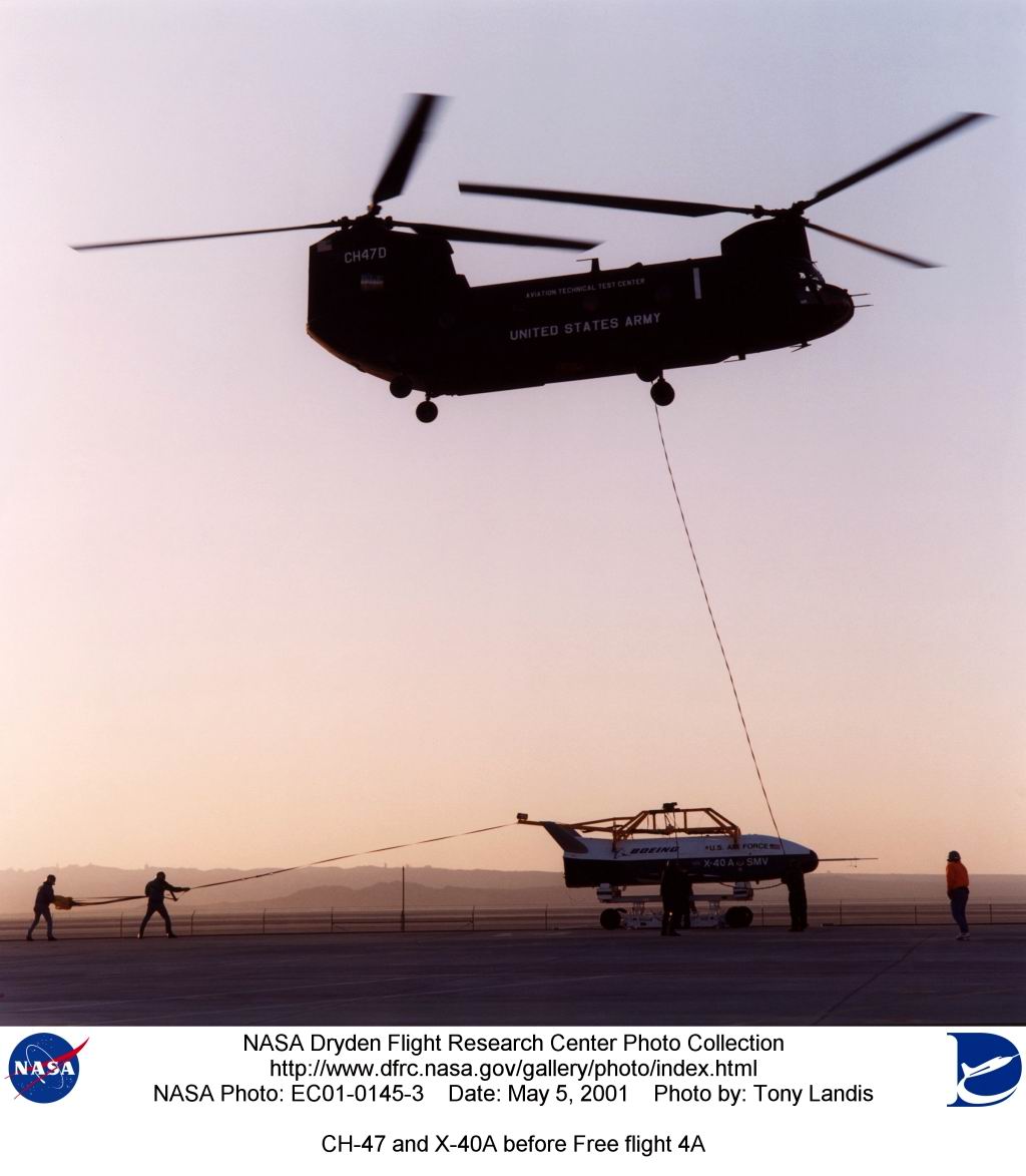 Le X-37 et le X-40A : Le 14 mars dernier, pourtant, les habitués de Nasa Dryden n’en croient pas leurs yeux : on recommence l’histoire, une nouvelle fois, trente ans après. A 8 h 29, en effet, ce matin-là, un Chinook de l’Army enlève sous élingue un engin, le mène à 15 000 pieds… et le largue comme au bon vieux temps de l’Hyper III. L’appareil descend, effectue un bel arrondi et se pose à 9h 37 après un vol de 74 secondes, entièrement automatique. L’engin est le X-40A, de l’Air Force, il est construit par Boeing. 6 m de long, pour 3,5 d’envergure, et 1,3 tonnes, et possède lui aussi, comme le X-38, un GPS à bord. Il n’est en réalité que le démonstrateur à l’échelle 85% de son grand frère, le X-37, qui devrait être lancé de la soute de la navette spatiale. Beaucoup plus classiques que le X-33, l’appareil pourrait bien servir de base de réflexion au futur SLI, et être lancé par une fusée à étages, façon…DynaSoar. Les militaires de l’Air Force semblent davantage avoir l’écoute de G.W. Bush, à la politique spatiale plutôt reaganienne : ils insistent en ce moment pour que le Raptor entre finalement, après 10 années de développement, en service actif, alors que Clinton avait plutôt freiné la tendance, le jugeant déjà techniquement dépassé. Et demeurent les seuls désormais à présenter un projet de lifting body qui débouchera sur une réalisation tangible. Leur SMV, pour Space Maneuver Vehicle , ressemble un tantinet au projet russe Ouragan…La guerre des étoiles est de retour ! |
