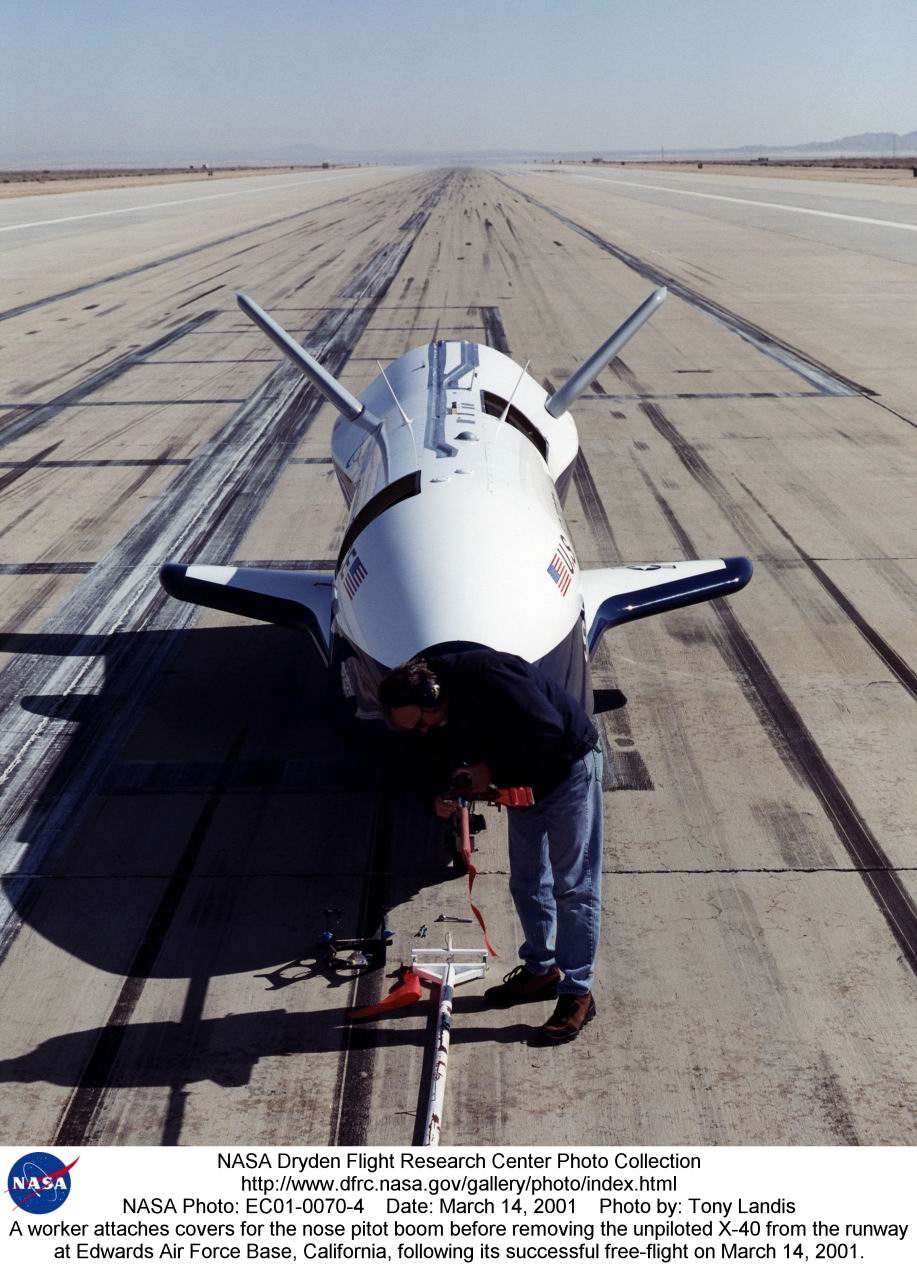 Ce n'était pas vraiment un camion de l'espace, plutôt un camping car, car dans la navette on peut aussi vivre, manger et dormir, c'est un peu aussi un hôtel volant". Ce dont on n'a plus besoin aujourd'hui: ce n'est donc pas un simple remplaçant à la navette qu'il faut construire, contrairement à ce que propose l'administration Rumsfeld, engoncée dans sa pensée digne des pires heures de la crise de Cuba. C'est un ou plusieurs véhicules de transport pour ravitailler l'ISS, et rien d'autre. L'ISS c'est l'hôtel trois étoiles, l'OSP, le break Laguna pour s'y rendre via l'autoroute de vacances. Le X-40 ou SMV entièrement automatique correspondent pourtant à cette attente. C'est à l'échelle 1/85 eme le futur X-37 de Boeing. Ce dernier a bénéficié en définitive d'un revirement subit de l'administration Bush, qui lui a accordé le 20 novembre 2002 la bagatelle de 301 millions de dollars (inclus jusque 2006) pour continuer son développement. Il devrait donc voler dans l'atmosphère dès 2004 et dans la stratosphère en 2006. Le X-37 plaît aux militaires car il possède toujours cette possibilité de se poser de façon manœuvrante, même s'il est entièrement automatisé, les militaires s'étant faits depuis aux véhicules sans pilote : le Pegasus X-47 venant d'effectuer son tout premier vol, le 29 juillet 2002, et tous les constructeurs (Grumman-Northrop, Boeing, etc) ayant dans leurs cartons des engins similaires. La prochaine mini-navette risque fort de ne pas avoir de pilote à bord... remarquez, l'atterrissage de la précédente était déjà entièrement automatique... Autre revirement prémonitoire: le même jour, un contrat de 53 millions est accordé à Lockheed Martin pour l'étude et la réalisation d'un système pour sauver les cosmonautes sur le pas de tir... |