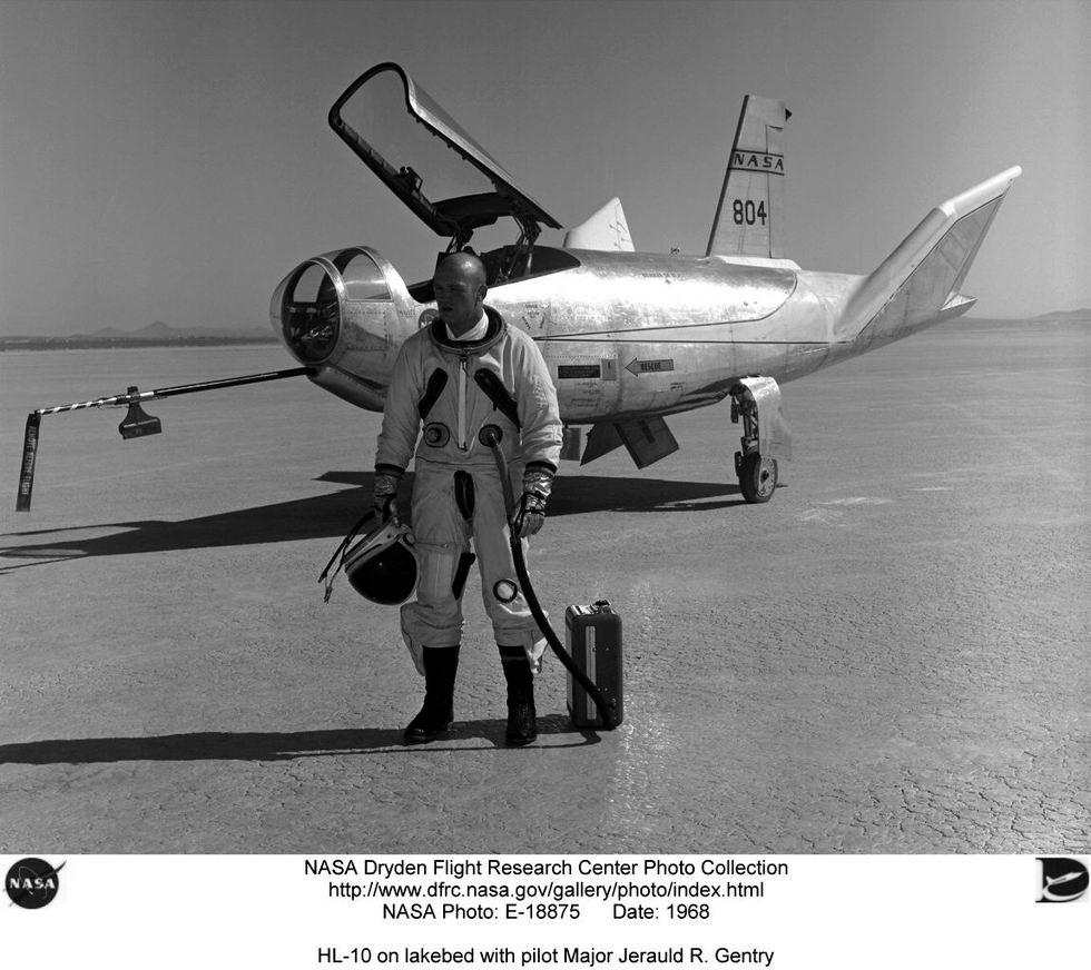 Le 2 juin 1964, c’est Northrop qui est la première retenue. Elle vient de terminer le T-38, et n’a pas d’autre projet en cours. Ce n’est pas une remise en cause des techniques élaborées auparavant, puisque la firme puisera un bon nombre d’éléments de son lifting body dans ses propres stocks de pièces (« on the shelf », pris sur l’étagère). Le siège éjectable et la canopée du T-38, les roues arrières du F-5, le siège éjectable du F-106, et la roulette avant du T-39 serviront à construire deux prototypes pour un contrat de 1,2 millions de dollars chacun, en 19 mois de construction. Un tarif hors du commun, et des délais super courts, même à l’époque : les briques volantes demeurent des engins très abordables et ne nécessitant pas de prouesses techniques pour leur construction ! Pour tout dire, le président de Northrop, à l’époque, Richard Horner, est également membre associé de la NASA depuis alors 4 ans. Ceci explique cela. L’appareil, qui est destiné à effectuer de « l’Horizontal Landing » (atterrissage horizontal par opposition à l'atterrissage verticale sous parachute) et dont la superbe ligne est la dixième épure dessinée par les ingénieurs de Northrop s’intitulera donc tout bonnement le HL-10, Il a fière allure. Beaucoup trouvent que c’est le plus élégant de tous. A défaut d’être le meilleur de tous ! |