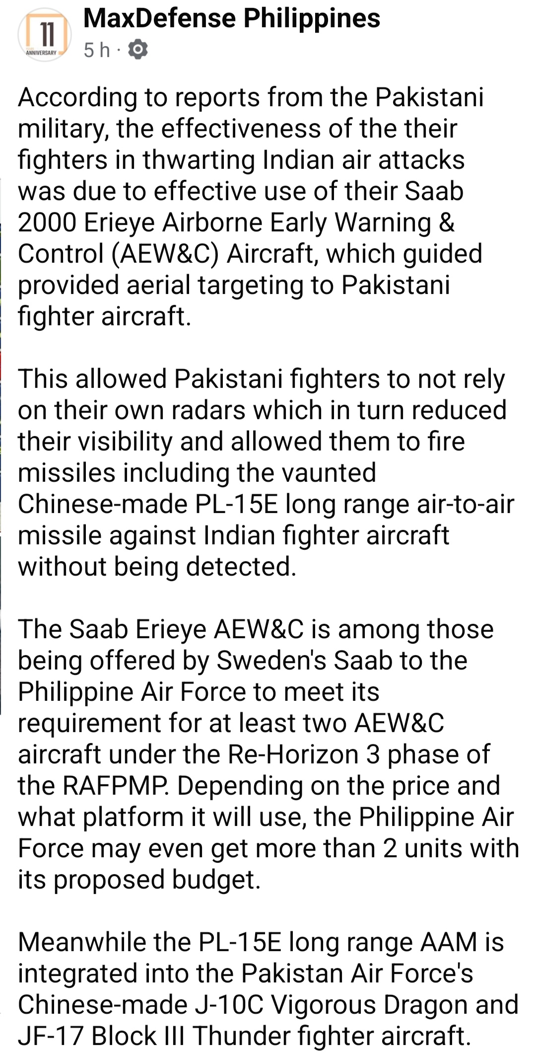• Donc apparemment les SAAB Erieyes semblent avoir joué un rôle important dans les victoires aériennes pakistanaises. J'avoue que je ne me souvenais pas qu'ils en avaient…